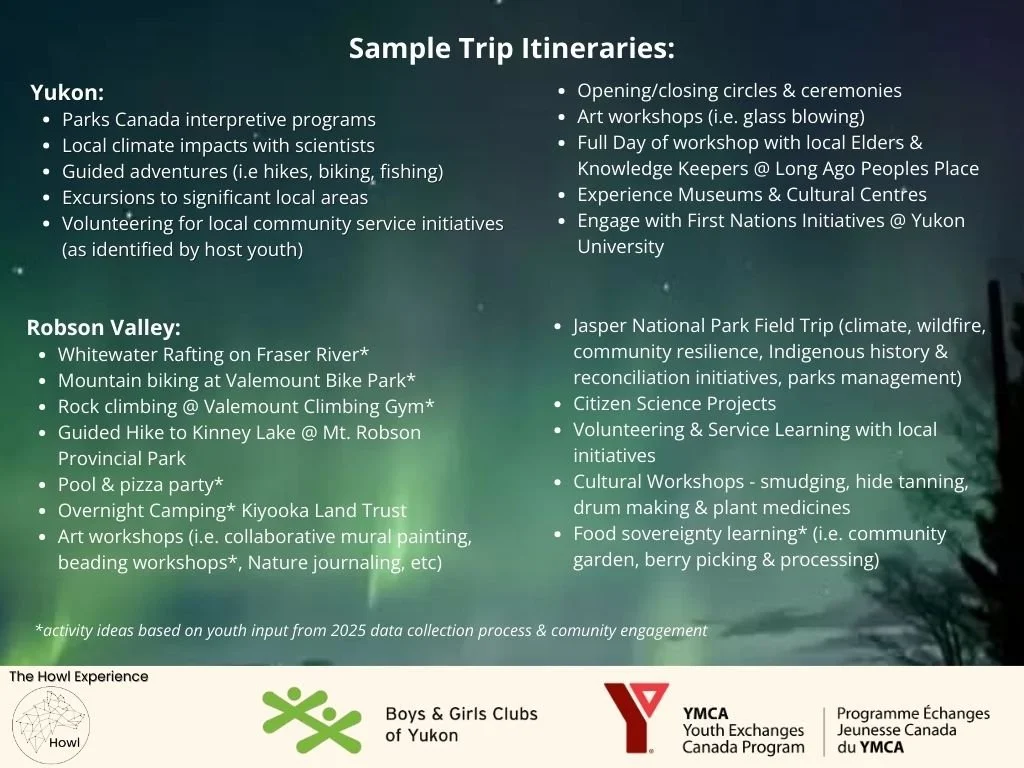 Howl has successfully applied to YMCA Youth Exchanges Canada to take the next steps in arranging a Summer 2026 youth exchange program between youth in the Whitehorse area of the Yukon and the Robson Valley, BC.